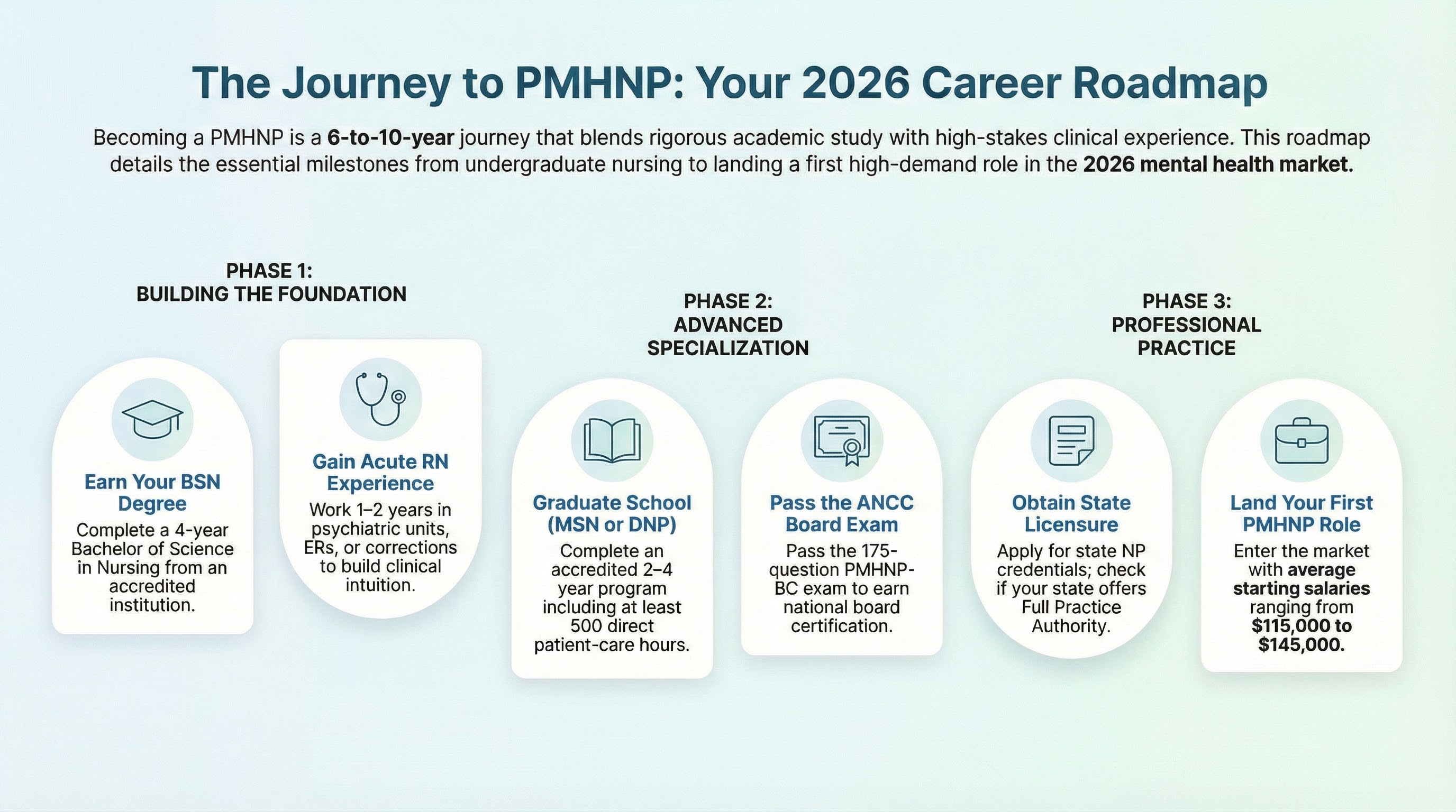 Becoming a PMHNP requires a BSN (4 years), RN experience (1-2 years recommended), and an MSN or DNP with psychiatric specialization (2-4 years). Total timeline: 7-10 years. After graduation, you'll need ANCC PMHNP-BC certification and state NP licensure. New grad PMHNPs earn $115,000-$145,000, with experienced PMHNPs earning $180,000-$210,000+.